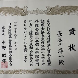 料理についてのお知らせ 2025.09.30 この度、料理長が公益社団法人日本全職業調理師協会主催の日本料理全国大会(郷土料理部門)において 受賞いたしましたのでお知らせいたします。 五泉市の秋をテーマにした料理で受賞いたしました。 < 前の記事へ 記事一覧へ 最近の投稿 料理についてのお知らせ りんご狩り 五泉市佐藤りんご園 ご報告 お料理について 巨木を見よう 将軍杉 五泉市一本杉 チューリップ畑は150万本 当館から車で15分 月別アーカイブ 月を選択 2025年9月 (1) 2025年8月 (1) 2025年6月 (1) 2025年5月 (1) 2025年3月 (2) 2025年2月 (1) 2025年1月 (1) 2024年11月 (2) 2024年10月 (3) 2024年7月 (2) 2024年6月 (3) 2024年5月 (4) 2024年4月 (1) 2024年3月 (2) 2024年2月 (1) 2024年1月 (2) 2023年11月 (3) 2019年2月 (1)